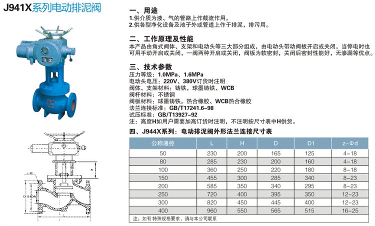 電動排泥閥又名電動隔膜排泥閥,由閥體、支架和電動頭等三大部分組成,由電動頭帶動閥板開啟或關(guān)閉,當(dāng)停電時也可用手動開啟或關(guān)閉,一閥兩種開啟或關(guān)閉,閥板為軟密封,關(guān)閉后密封性能好,無滲漏等優(yōu)點。