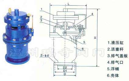 本閥由下閥體,中閥體,浮筒,浮筒桿,閥芯,蓋板,活塞桿,膜片及閥蓋等組成的全壓高速排氣閥,其特征是通過銷軸與浮筒鉸接的浮筒桿可繞主軸轉(zhuǎn)動,并由此實現(xiàn)通過浮筒升降控制閥芯的升降啟閉,即當浮筒下降(閥體里充滿氣體)時,閥芯上升,打開小閥口,并關閉小排氣帽上的排氣口,使氣體通過導管進入液壓罐內(nèi),當浮筒在浮力作用下上升時候,閥芯下降,關閉小閥口,同時打開排氣帽上的排氣口,使液壓罐通過導管,直通大氣泄壓,且當浮筒下降,液壓缸內(nèi)充滿氣體時,閥門上的大排氣口自動關閉。當水泵停止,管內(nèi)水流空時或遇到管內(nèi)產(chǎn)生負壓時,吸入空氣,確保管線安全。