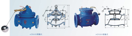100X隔膜式遙控浮球閥是兼具多種功能的水力操作式閥門.主要安裝于水池或高架水塔的進水口i處,當水位達